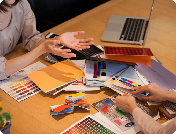 弊社では、素材や印刷などの製造方法を熟知したスタッフが、費用バランスも考えながら、最適な企画・提案をします。お客様の“こうしたい” に少しでもプラスアルファになるご提案で、お客様のご希望を引き立てる商品を生み出してまいります。